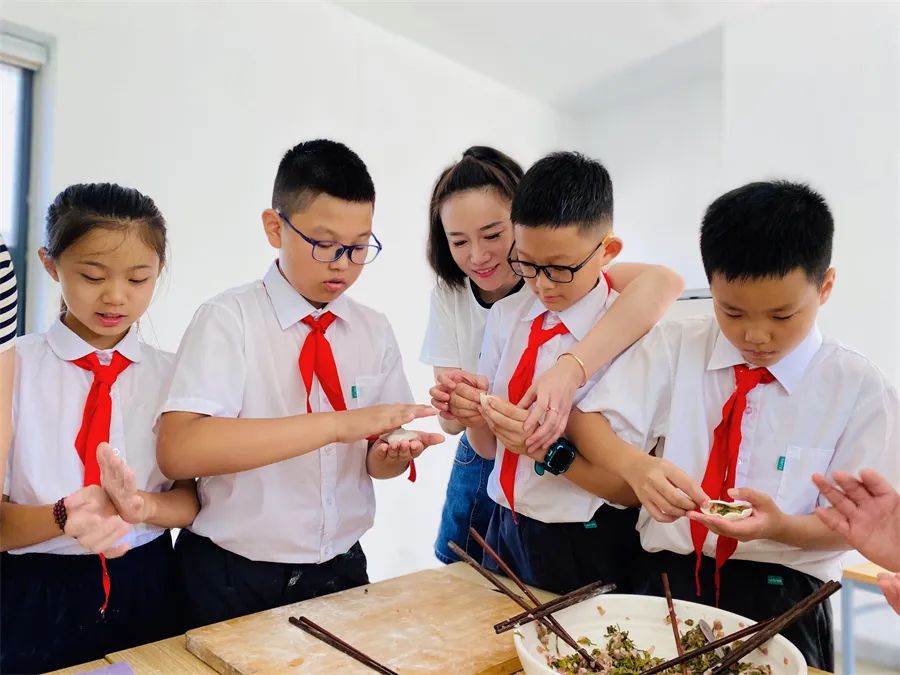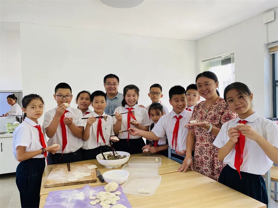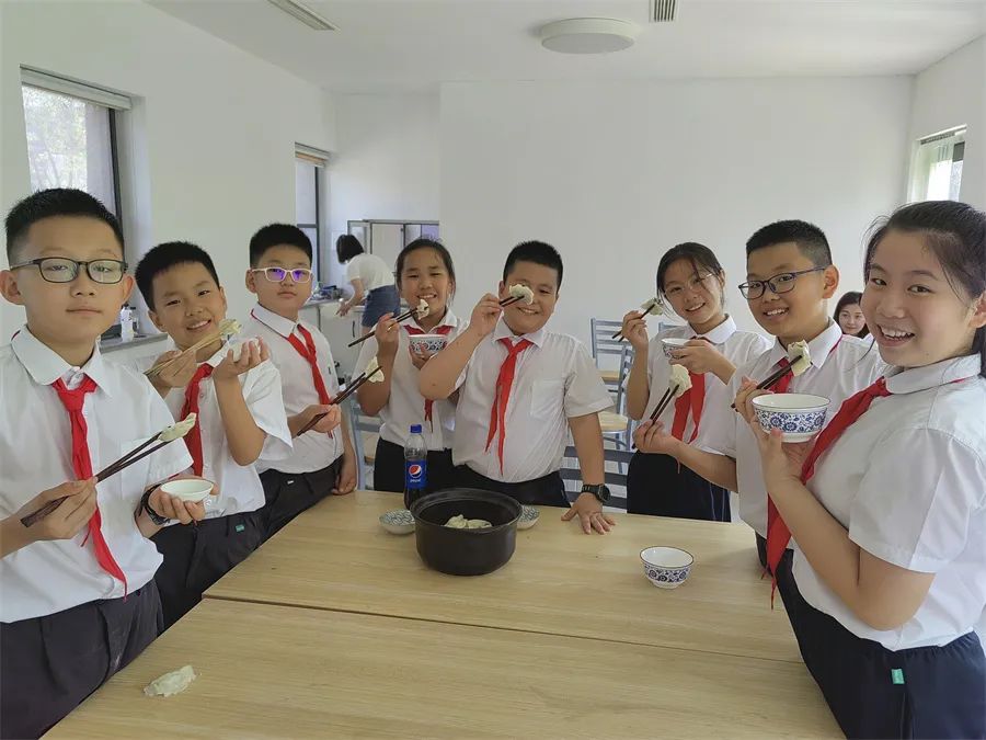 于是,在家長們的幫助下,隊員們又變成小廚師,有的和面,有的調(diào)餡,有的搟皮,大家分工明確,動手包起水餃來。不一會兒,一盤盤香氣撲鼻的茶葉水餃端上餐桌,吃著鮮嫩的茶葉水餃,喝著親手采摘的茶葉,隊員們臉上寫滿幸福。