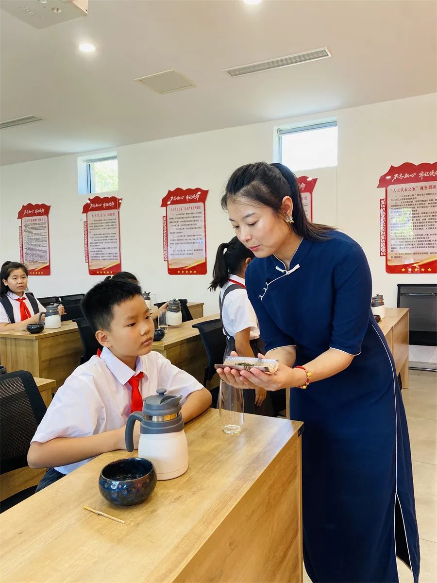 走進茶藝廳,茶藝師簡單地向隊員們介紹茶藝展示的幾個步驟:行禮、溫器、請茶、洗茶、泡茶、分杯和奉茶等。聽完講解,隊員們立刻化身為一名名小茶藝師,在老師的帶領(lǐng)下,一起學(xué)習(xí)茶禮,傳承茶道,感受中華傳統(tǒng)文化的魅力。