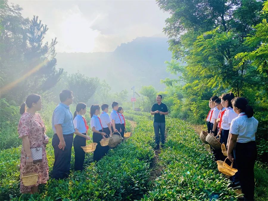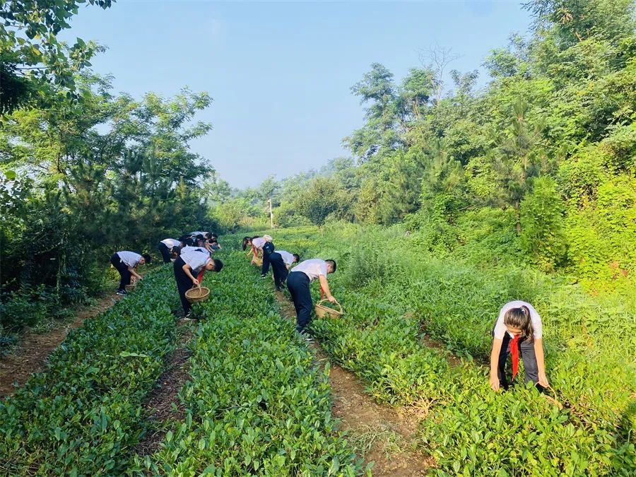 第二天一大早,隊員們整理好隨行物品,在校外輔導(dǎo)員的帶領(lǐng)下來到大梁山,入山采茶?!按蠹襾砜催@片茶園,名叫特早。顧名思義,它的茶葉生長要早于其它品種。大家采茶時一定要分清一芽一葉、一芽兩葉和一芽三葉,茶葉形狀不同,品質(zhì)也不一樣。”校外輔導(dǎo)員講解后,隊員們躍躍欲試。雖然山風(fēng)徐來,空氣清新,但采茶的忙碌已讓大家汗流浹背,種茶人的艱辛也能體會一二。