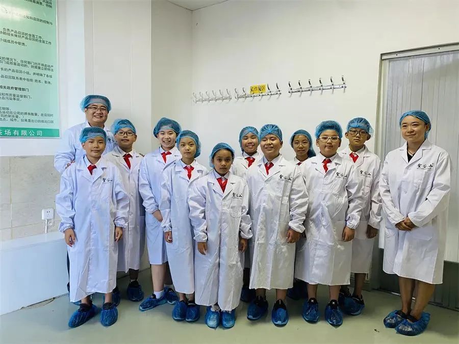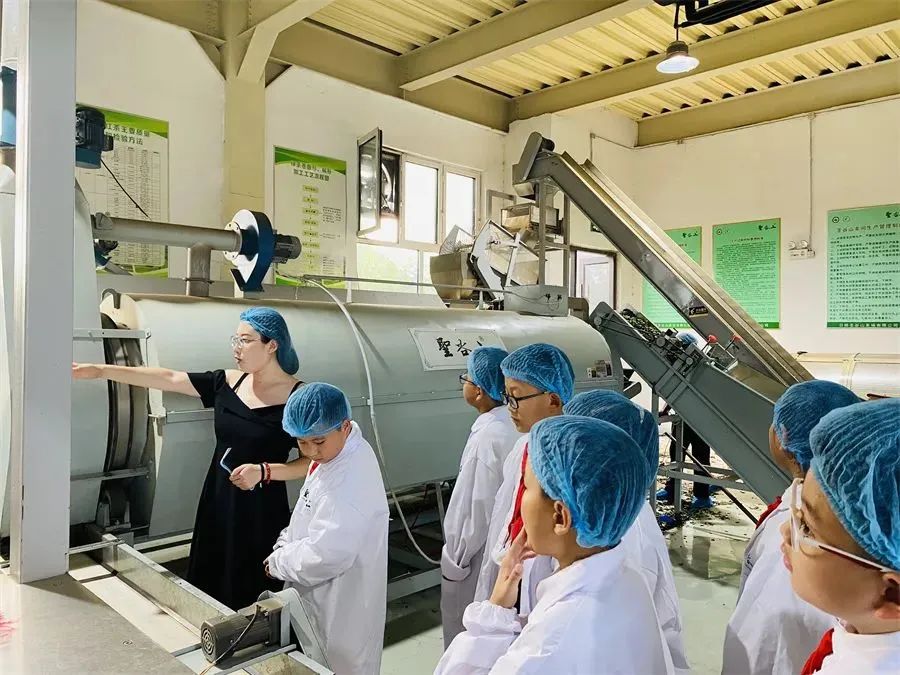 中午時分,一筐筐新采的茶葉被運回加工廠。隊員們立即穿上工作服,跟隨工人們一起加工生產(chǎn),探究茶葉的變化過程。嫩綠的新芽隨著傳送帶緩緩進入機器,經(jīng)過烘焙、炒制、壓平等九道工序后,我們常見的日照綠茶才基本成型。隊員們看到一包包茶葉慢慢滑出,再次豎起大拇指,為科技發(fā)展帶來的便利條件點贊,更為自己的辛苦付出加油。