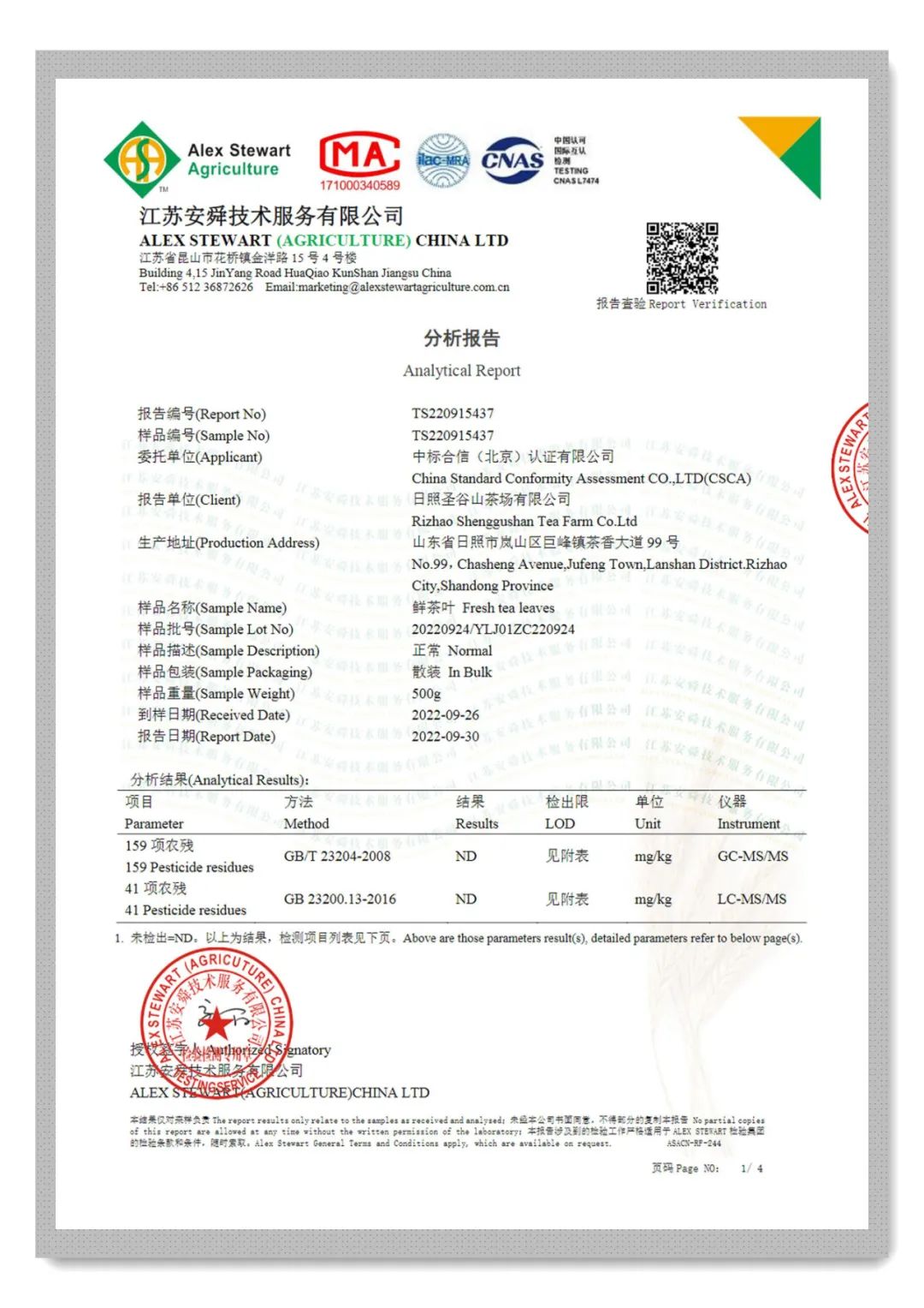 2022年9月24日,圣谷山國際有機(歐盟有機、美國有機、日本有機)認證正式開始,期間對圣谷山有機茶園進行現(xiàn)場采樣封存,并進行了200項的農(nóng)殘檢測,均為ND(ND=未檢出),圣谷山種植基地原料順利通過了國際有機認證的農(nóng)殘檢測。